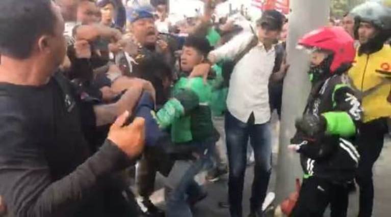 Situasi lebih memanas setelah salah satu yang diduga driver ojol memacahkan kaca depan satu unit mobil angkot yang beada di jalan tersebut.