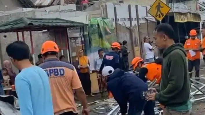 Petugas BPBD Kota Sukabumi saat mengevakuasi puing bangunan yang rusak akibat disapu angin puting di Sukabumi (ANTARA) Share Tweet