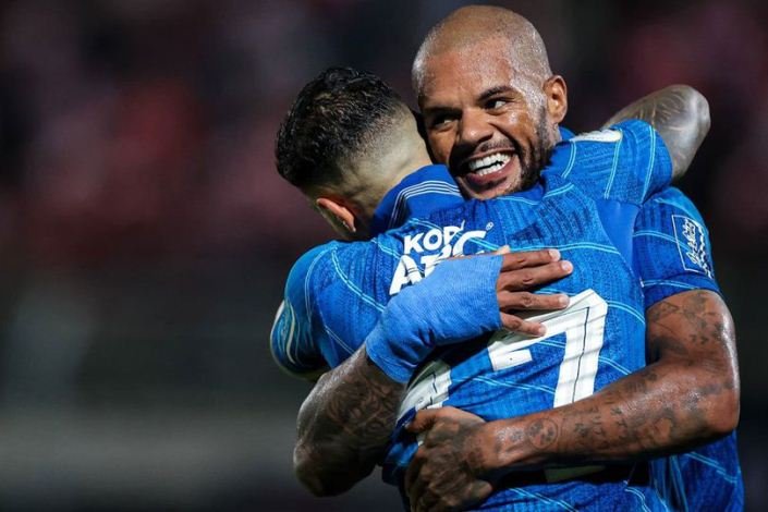 David Da Silva merayakan golnya ke gawang Madura United di leg 2 Final BRI Liga 1 2023/2024, Jumat (31/5/2024) (c) Bola.net/Bagaskara Lazuardi