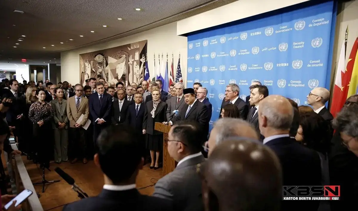 Joint Statement dibacakan oleh Wakil Tetap RI untuk PBB di New York, Duta Besar Umar Hadi, dalam media stakeout yang diselenggarakan bersama oleh Indonesia dan Prancis di Markas Besar Perserikatan Bangsa-Bangsa (PBB), New York, pada 9 April 2026.