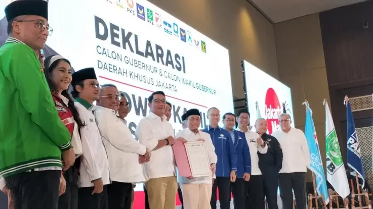 “Pada hari ini Senin 19 Agustus 2024 partai politik yang tergabung dalam koalisi Jakarta Baru untuk Jakarta Baru menyatakan mengusung Ridwan Kamil sebagai calon gubernur dan Suswono sebagai calon wakil gubernur pada pemilihan kepala daerah khusus Jakarta 2024-2029,” kata Muzani dalam acara deklarasi di Hotel Sultan, Jakarta, dikutip CNN Indonesia, Senin (19/8/2024).